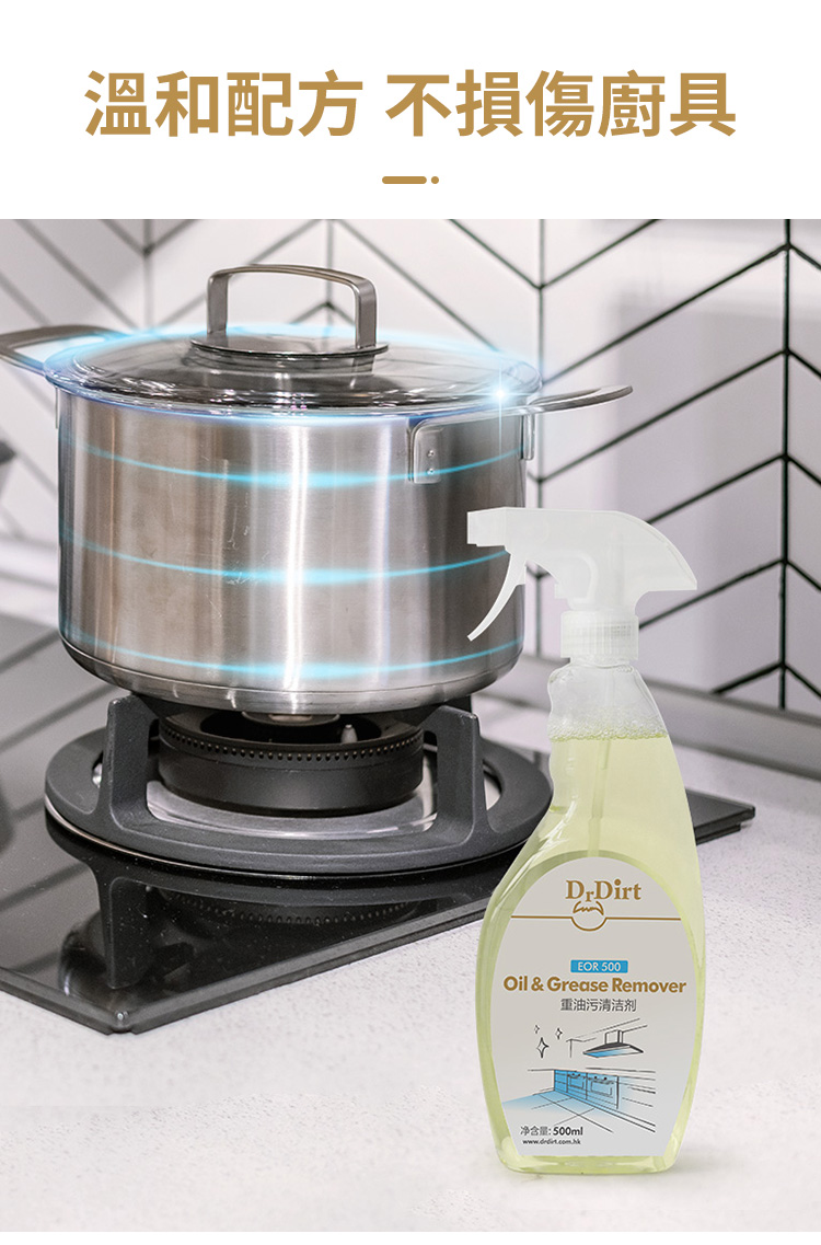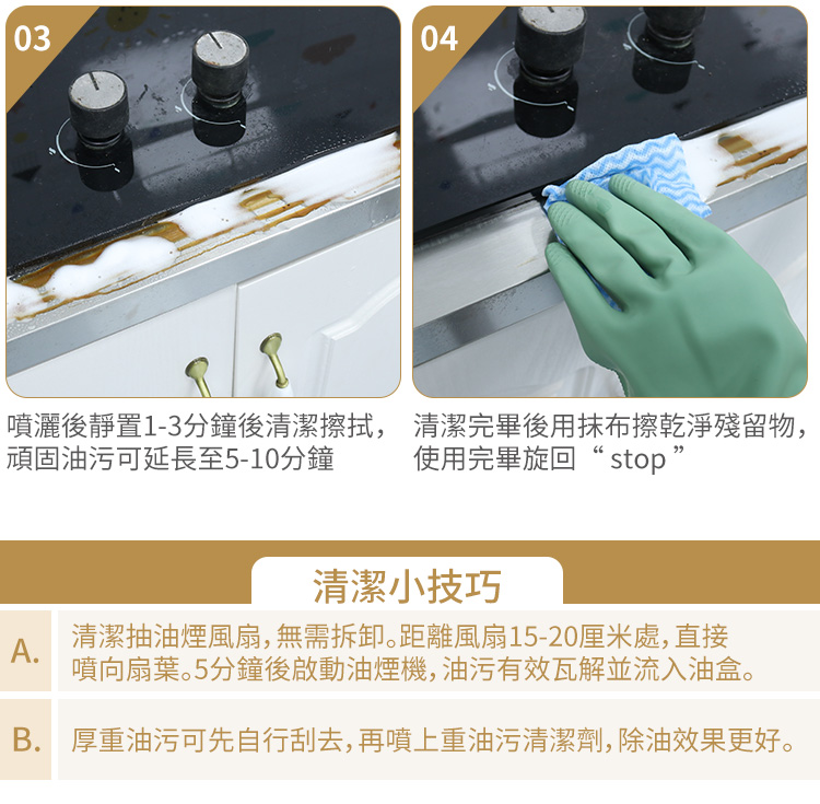 - 頑固油污可延長至5-10分鐘後才清潔擦拭