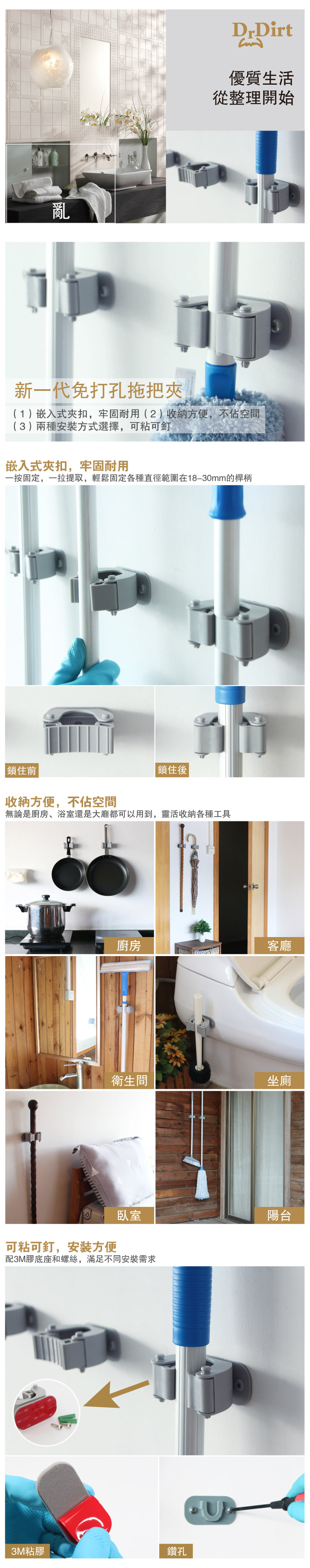 施達 免打孔橡膠拖把夾 (4夾扣 4短鈎)