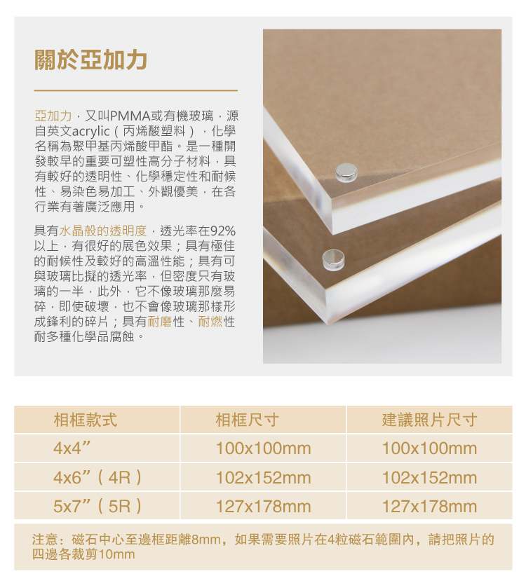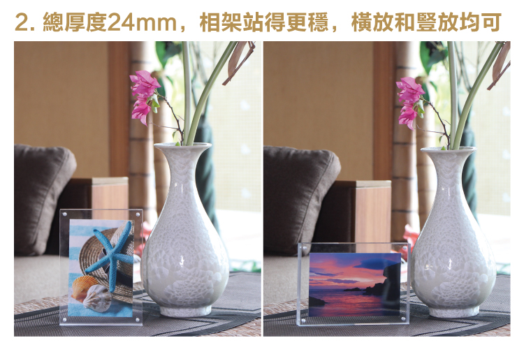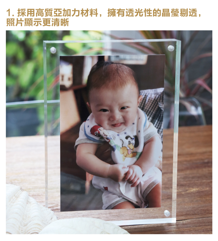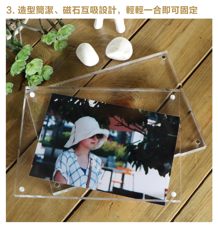 - 安裝簡單,利用磁石互吸原理,把照片放在兩塊亞加力之間即可固定