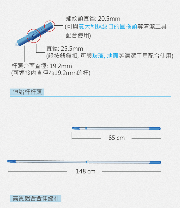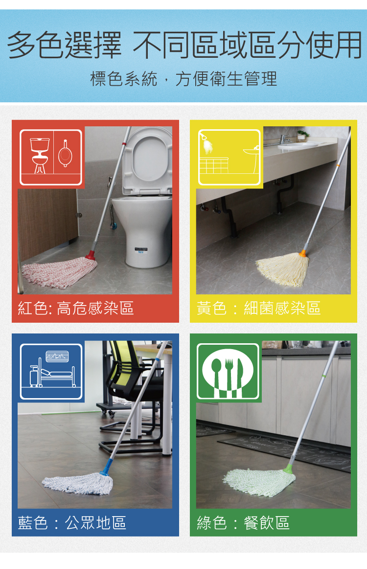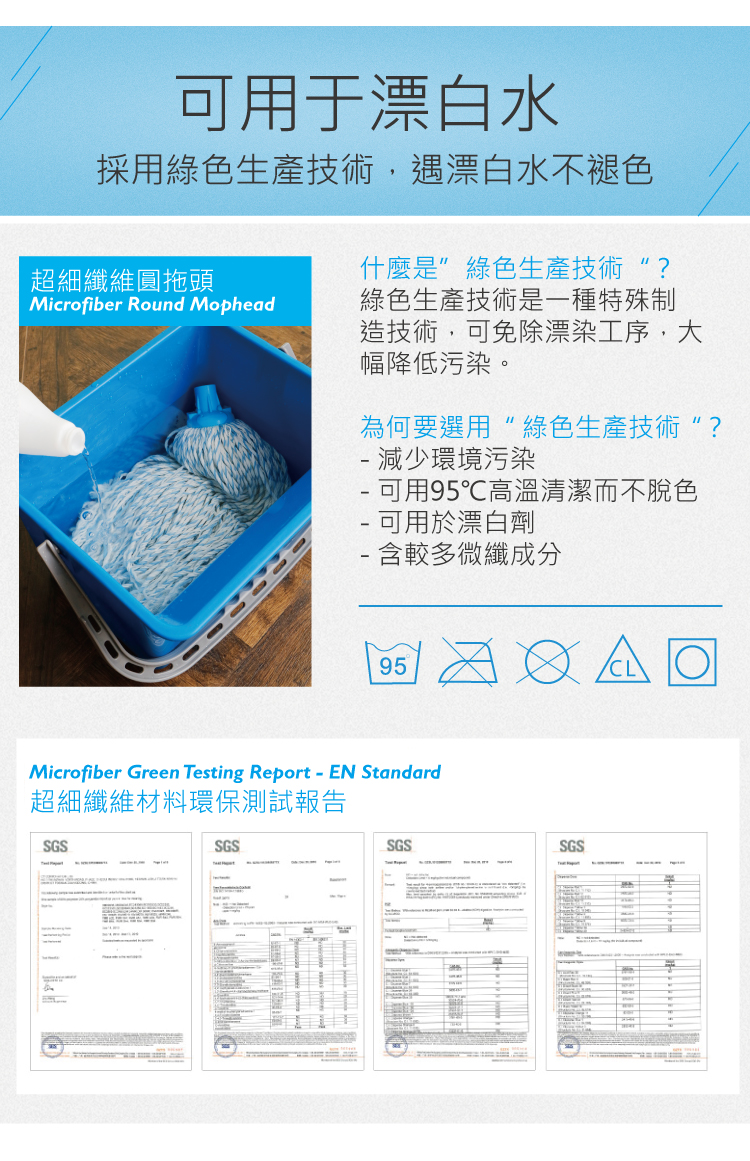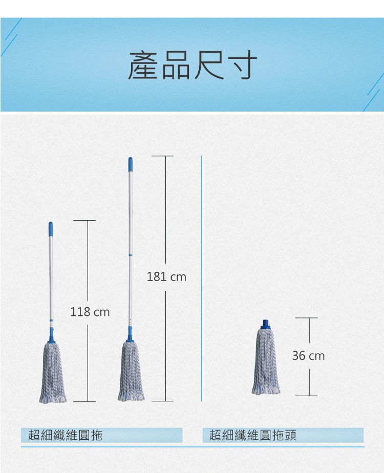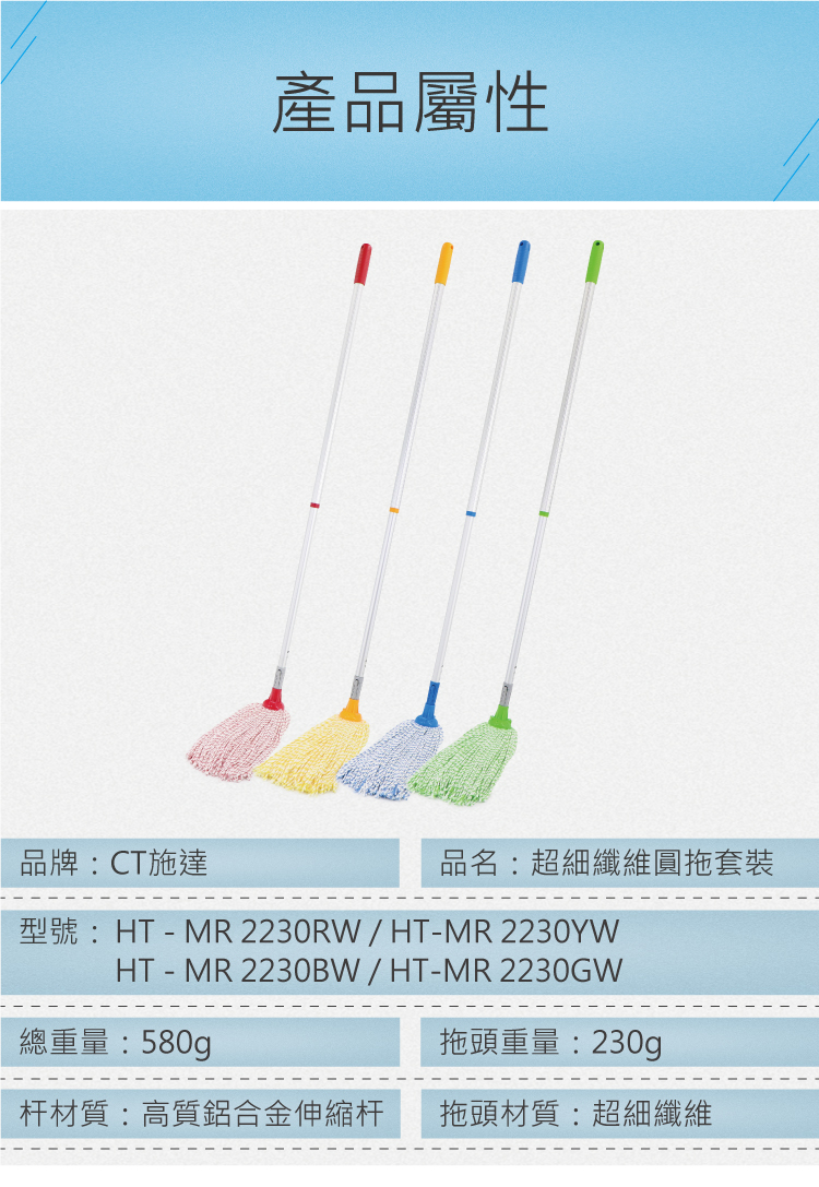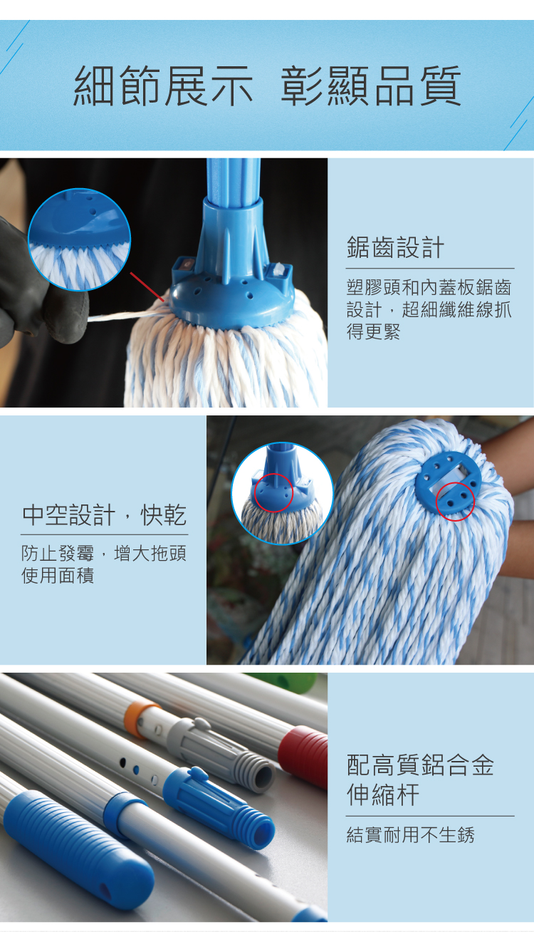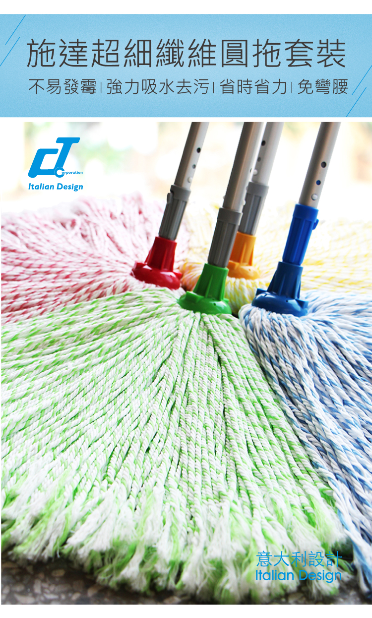 - 適合小面積家庭環境使用- 綠色生產技術,地拖頭可用於漂白水- 地拖頭採用超細纖維材料,通過環保測試,擁有更強的清潔能力- 四色選擇,有效區分不同區域使用,減低交叉感染風險- 高質量鋁合金伸縮拖把桿,調節長度達181cm,符合國際出口標準- 一支桿永久壽命,用舊了勤換地拖頭即可- 配用本店15L圓頭地拖桶使用更方便快捷